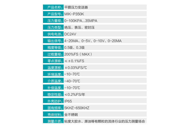 MIK-P350系列平面膜结构压力变送器选用德国进口扩散硅芯体,采用平面膜直接感受压力。传感器接口有卡箍式,M27×2,法兰式可供选择。输出信号有电压、电流、频率信号等可选择,传感器平膜片防止了结垢,不卫生及粘稠液体堵塞等问题。广泛应用于食品、医药、卫生及酿酒工业等部门。